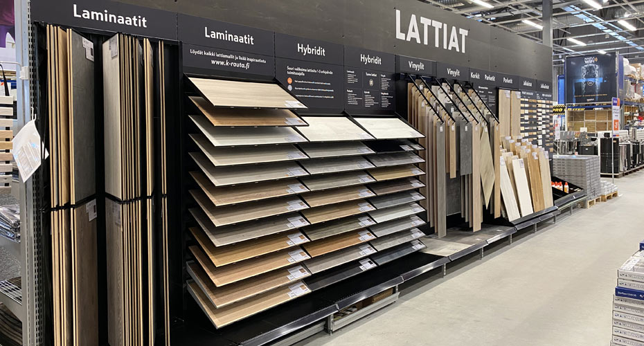 ”Kaupan alalla tärkeää on myös kalusteiden muuntojoustavuus. Olisi hyvä, jos kalustetta voitaisiin käyttää vielä viiden vuoden kuluttua, jolloin tuotteet ovat kenties ehtineet vaihtua erilaisiksi.” Hyvän esimerkin myymäläkalusteiden uusista konseptiratkaisuista tarjoaa Holopaisen mukaan lattiapäällysteiden osastokonseptin uudet esillepanoa parantavat varusteluosat, joiden avulla valikoima voidaan esitellä asiakaslähtöisesti sekä havainnollisesti ja kaupallisesti.